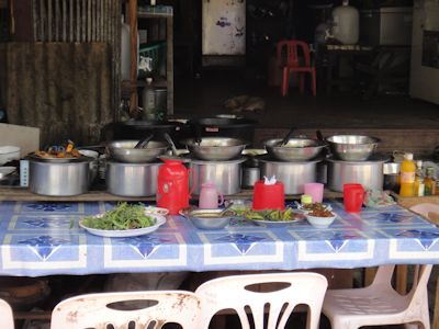 ミャンマーの大衆食堂には、銀色の鍋が並んでいる。