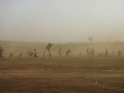 このようなカンカン照りがしばらく続くと思っていたのだが、この日夕方からいきなりにわかに空が掻き曇り、風が砂埃を巻き上げ始めた。嵐の様相だ。午後5時。吹きすさぶ風と巻き上がる砂の中、職員たちはパアン市内に戻るトラックで帰宅。