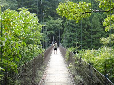 僕らは公衆トイレで用を足した後、シダクラ橋を渡る。「3人以上では渡らないでください」との表示、なるほど板張りのつり橋は、えらく揺れる。そして割と高い。奥多摩の山と下を流れる多摩川が素晴らしい景観を織り成す。高所恐怖症の裕助が悲鳴を上げる。