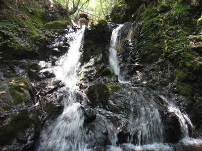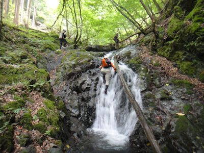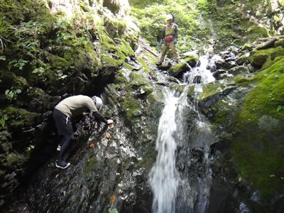 シダクラ沢は、苔むす岩が連続し、その間を清流が流れ落ちる。2m~5m位の滝が多く、越えていくのに楽しい。