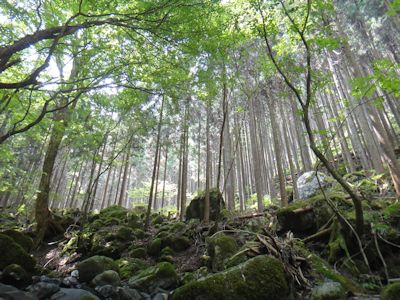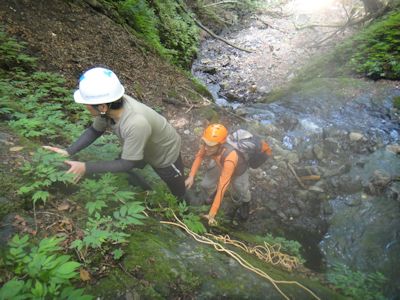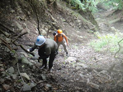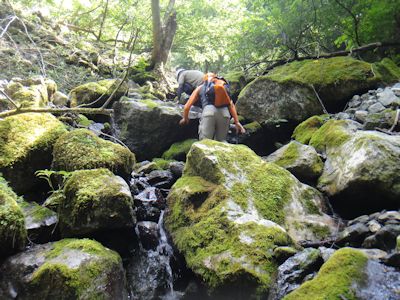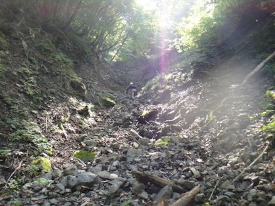 始めは、川床に石が残ったガレ枯れ沢。何しろ急斜面なので、登るにつれ石をどんどん下に落としてしまい、下から登ってくる人は命がけ状態となる。