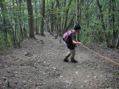 こんなガレ場を這いつくばって登る。すぐに疲れて休憩する。しばらく登ると、石が消え、土の急斜面となる。水があったら滝のような場所だ。高さはわずか1mほどなのだが、ここの土がずるずると滑って苦戦する。トップで登っていた僕は、ここを他の人がクリアできるかが心配になるも登り切る。コンスケは右斜面にあった蔓よりも太い木を掴みながら登る。石坂はこのズルズル斜面を登れない。上から僕とコンスケでロープを出し、引っ張り上げてやっとのことでクリア。
