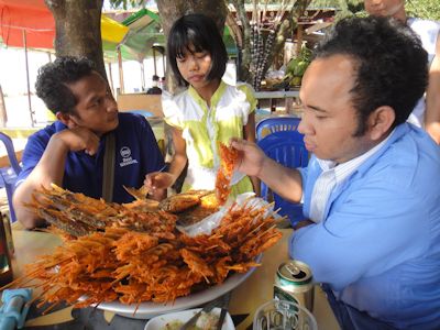 頭にお盆を乗せた少女が営業にやって来る。彼女はエビや魚の揚げ物を観光客に売り歩いている。聞けば、小学校4年生だという。
