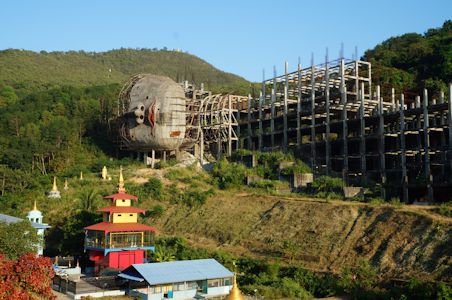 ここには2体の向かい合った巨大な寝釈迦仏が横たわっている。ただ、1体はまだ建設中であり、進捗はまだ顔の途中までしかできていないので、いつ完成するのか見当もつかない。見たところ工事が進んでいる様子はなく、打ち捨てられたいにしえの廃墟のようにも見える。