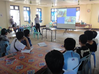 交通安全の講義。交通事故の悲惨な写真を説明。 |
