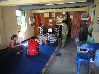 テレビはあるが画面は小さい。一方、その横にデカいスピーカーがあり、ウピョンジーはカラオケを流し始める。ミャンマーの水祭りの時に盛んに流れる伝統歌だ。日本で言えば、盆踊りの「何とか音頭」みたいなものだろうか。
