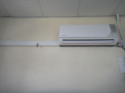 さて話を本題に戻すと、エアコンは、私の机から見ると4mほど離れた向かいの壁の上部にある。エアコンの室内機と室外機を接続する箱型の白い配管が、エアコンの横の壁の上を這って設置されている。