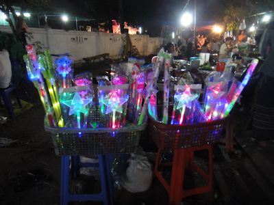 外の大通りでは露店が出ている。プラスティックの棒が色とりどりに光る、光物を売る店、本やCD,DVD売る店、いつもの揚げ物屋台などが出ている。こういう祭りではいつもたくさん出る、円形をした巨大せんべいのような伝統菓子を売る店。あれはきっと作りやすいからたくさん出るんだろうな。