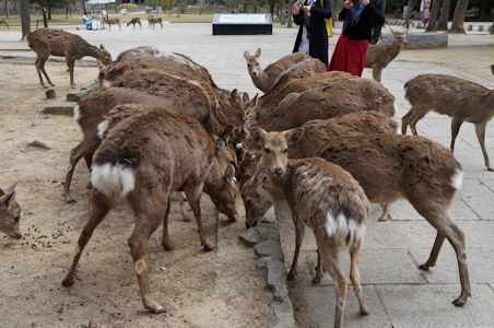 奴らは基本大人しいのだが、人間が鹿せんべいを持っていたり袋の中に食い物を隠していたりすると、猛然と人にたかってくる。中には食物が入っているのであろう袋に嚙みついて引きちぎろうとする輩もいる。それほど腹が減っているのか。奴らの目の色の変わりようは恐るべきものがある。