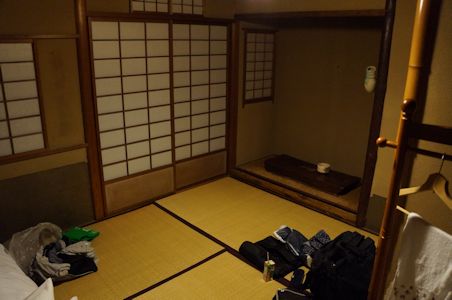 僕が泊まった5畳の和室は、茶室として使われていた部屋で、小さな障子戸があったり、小型の畳がはめ込まれていたりと面白い構造をしていた。中庭に面した障子戸を開けるとすぐに外である。今日の寒さから言って夜は相当厳しいかと思っていたが、部屋にはファンヒーターがあり、電気毛布もあったので杞憂だった。