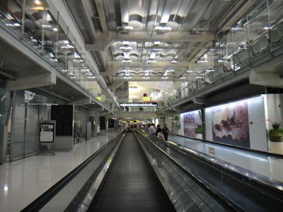 バンコク スワンナプーム空港。巨大な空港で、動く歩道が延々と続く |