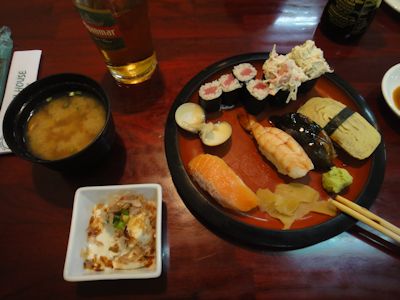 写真右上の軍艦巻きはサラダ巻で、こちらではこのマヨネーズ和え系のサラダ巻が人気のようである。(翌日も一人でこの寿司ハウスで夕食を食べたのだが、別の寿司セットにも、サラダ巻は入っていた)