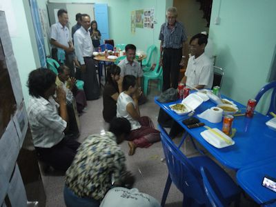 まぁ、そんなスピーチ合戦も30分くらいで終了。ここでもまだ食事は始まらない。お次は餞別のプレゼント贈呈。その後、この国ではよく見かける光景なのだが、この送別されるエンジニアが椅子に座り、それに対して、みんな(全員ではないが)で土下座して、僧侶に対するように、拝み、頭を床に擦り付けんばかりに礼をする。彼が60過ぎの年輩であるということもあるのだろう。