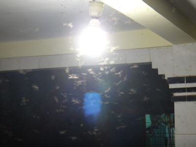 すごい勢いで電灯に群がる羽虫。ほとんど1種のみ。 |