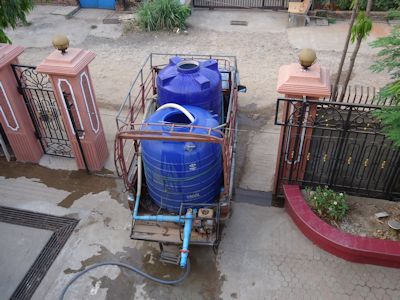 水を外から購入。ポンプでスタッフハウスの水タンクへ移す |