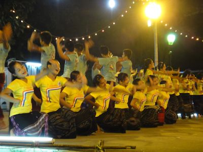 広場に入る。ステージでは、1グループの持ち時間30分くらいで、次から次へと踊りと歌のグループが出場しては、カレン州独特の踊りと歌を披露していた。今日はカレン州の民族衣装をばっちりと着こなしたグループは少なく、揃いのTシャツにロンジーという、いかにも学生風のグループが多かった。ステージ前では、これを見物する人たちが黒山を作っていた。