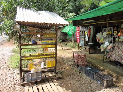 ミャンマーの道端では、このようにペットボトルに入れられてガソリン