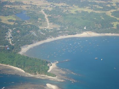 ヤンゴンを飛び立った飛行機は、一度タンドウェに着陸する。再び飛び立ってシトウェへ。ラカイン州は、ベンガル湾とバングラデシュに接している。鮮やかな青い海が飛行機の窓から見下ろせる。漁船だろうか、岸に近いところの海面におもちゃの木箱のように浮かんでいる。