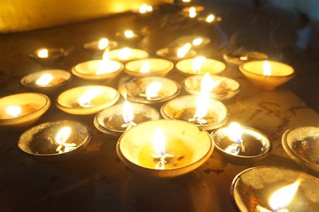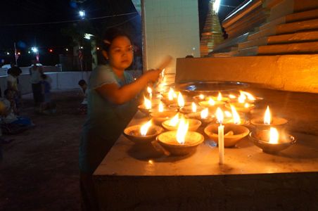 パゴダに寄る。靴を脱いで敷地に入ると、ライトアップされたパゴダの周りに、たくさんのろうそくが皿に置かれて瞬いている。座って祈りを捧げる人々。