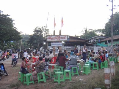 私のスタッフ宿泊所のすぐ近くでは、即席のイスとテーブルが並べられ、集まった近所の人々が何やら飲み食いしながら歓談している。僧の説教でもあるのかもしれない。