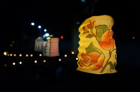 提灯というか燈籠が道端に張られた紐に吊るされて、夜の道をほのかに彩っている。これらは日本のような電球ではなく、中にロウソクが入っている。まさに迎え火。