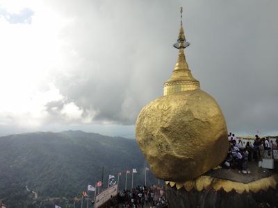『地球の歩き方』によれば、この岩の上にある高さ7mの仏塔に納められた仏陀の頭髪が、この岩の微妙なバランスを取っているのだという。