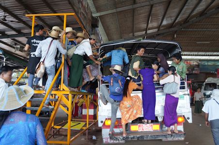 山の上にあるチャイティーヨーまでは、営業を許可された指定のトラックの荷台に乗っていくことになる。チャイティーヨーまでの山道は、普通の車は乗り入れ禁止のようである。