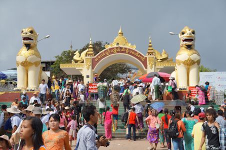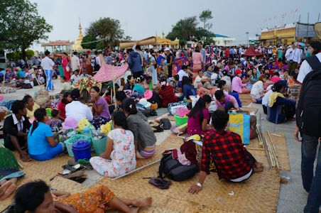 どうやら今日は観光には最悪の日のようだ。雨季が終わり晴天が続く乾季となり、3連休の中日、しかも明日は仏教では重要な祝日、満月の日に重なり、ミャンマー各地でイベントや祭りや仏教行事が行われている模様。人々はヤンゴンから、ミャンマー各地から、この仏教徒の聖地、チャイテーヨーに押し寄せている。ヤンゴンからも車で3時間ほどなので、大型バスの姿も多い。
