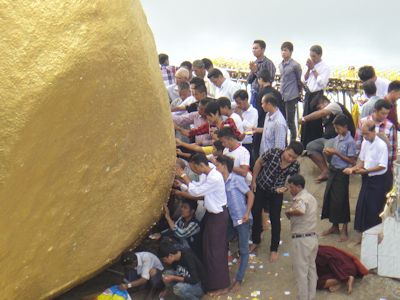 このゴールデンロックに金箔を貼ってお祈りするとご利益があるらしい。だがこの岩には女性は触れず、男だけの金箔貼りとなる。