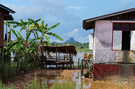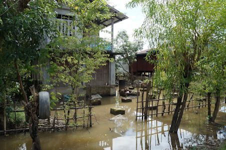 暑い。今まであまり歩いたことのない道に入って歩く。この辺りは水没地帯で、雨季になると水浸しになる。雨季は終わりかかっているが、水はまだ全然引いていない。家はそんなわけで、ほとんどが高床式になっている。
