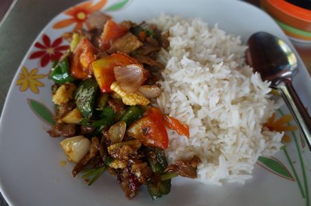 タイレストランの肉野菜かけごはん。甘辛で美味い。が高い。 |