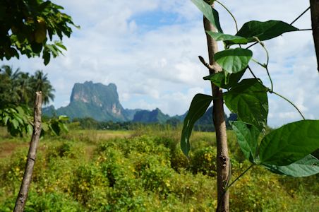ヤシの木が大きく枝を広げる。熱帯地方で必ず見る光景だ。そしてその先に、パアンのシンボル、ズウェカビン山の緑の山肌が青い空と白い雲に映えている。