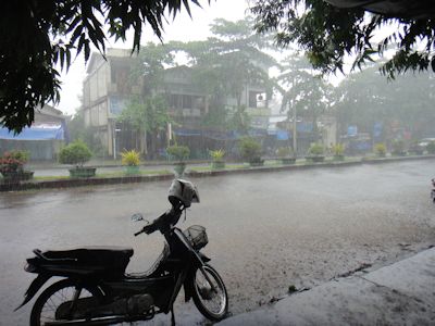 15分ほど休んで小降りになったので再び漕ぎ出すと、またまたすぐに今度は本格的な大降りとなった。大きな寺院の前、バイクタクシーの運ちゃんたちが休んでいる屋根のある一画に退避する。そこには一人の警官がいて、僕を丁重に迎えてくれた。木のベンチを指さし、「ここに座れ」と有無を言わさない。僕は言われるままに座る。