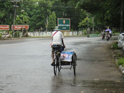 サイカーのおっちゃんは、雨を避けるものと言えば、頭にかぶった笠だけである。