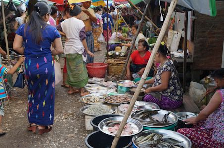 ここで僕はミャンマーに来て初めて食用にカエルが売られているのを見た。ミャンマーでは割とカエルを食べるようである。足を伸ばせば20cmはあろうかという巨大カエルが、一つの皿にはそのまま山積みにされ、もう一つの隣の皿には、皮を全部剥いで肉がむき出しになった状態で売られている。