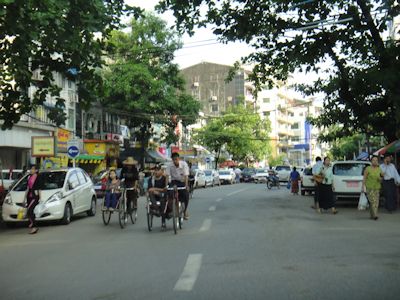 ヤンゴン市中心部では、バイクは禁止だがサイカーは禁止ではない。彼らは、平気で車道のど真ん中を走る。