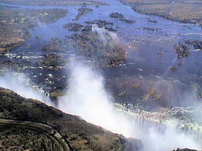 上空からビクトリアの滝を見ると、ザンベジ川の広々とした緩い流れが、突然地の果てに落ち込むように見える。深遠な陥没との遭遇。自然が造った、スケールの違う凹凸。なんか、イグアスの滝と同じだ。イグアス川も滝の上流部はとても広くて緩やかな流れ。それが深い陥没に行き当たるのだ。