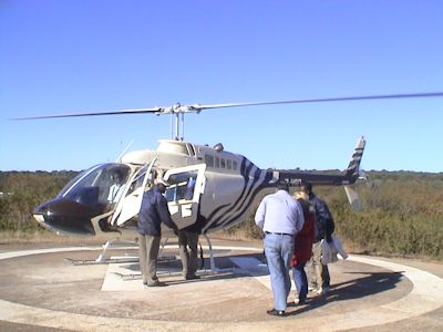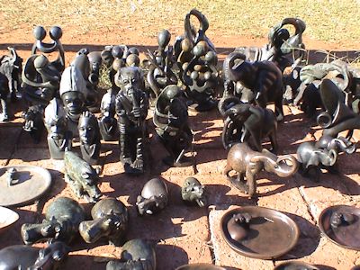 近くのヘリコプター発着場から飛び立つ。ヘリコプターの観光客には、スペイン語圏の団体客がいた。アフリカ土産を売る物売りが、アフリカならではのさまざまな置物を広げている。ゾウ、カバ、怪しい民族。