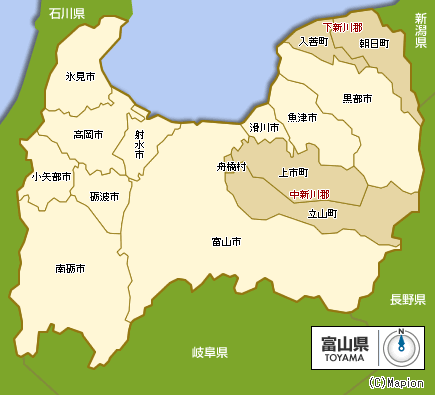 富山県 路面電車の走る富山、3大大仏の高岡。 奇跡の海、富山湾の海の幸。 市町村名をクリックしてください ■富山市 ■高岡市 ■南砺市 福光のカーブ (南砺市)