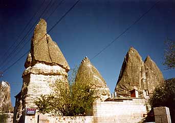 途中一度トイレ休憩をして、バスは4時間でカッパドキア観光拠点の町、ギョレメに到着。ギョレメのオトガル(バスターミナル)はこじんまりとしていていかにも「田舎のバス操車場」という趣。いくつかの観光案内所が操車場に面して軒を連ねる。バスを降りると、強烈な日差しに目がくらみそうになる。オトガルからすぐに小高い山が見えるが、そこにはもう奇岩風景が展開している。とてつもなくいい天気だ。