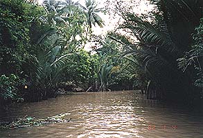 ボートは、巨大なメコン川に浮かぶ中州の島を通り抜け、対岸のベンチェー村へ到着。その景色は、ジャングルに近い。ここでは、巨大なやしの木、バナナやパパイヤ、マンゴー、ジャックフルーツ等、あらゆる果物の樹が立ち並んでいる。ココナッツキャンディー工場を見学し、雑貨のお土産を買い、再びボートへ戻る。(ベンチェーの風景)