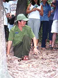 目的のベンディンのトンネルに到着。そこでは、現在も残っている一部の地下トンネルに入れるほか、解放戦線のゲリラ達が作った武器や落とし穴の展示がある。さらに、射撃訓練場があり、体験射撃も出来る。左の写真は、小さなトンネル入り口に入ってみせるツアーガイド。(クチトンネルツアー)