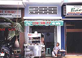ホーチミン2日目。この日は市内観光で街中を歩きまわった。1日目に1万5千円使ったが、普通にベトナムで過ごす分にはほとんど金がかからないことが、2日目に分かった。食事は、道端にいすとテーブルを出している屋台食堂で食べれば、10000ドン(=90円くらい)もあれば美味しいものが腹一杯食べられるのだ。街には、そこら中に「COM(コム、米飯のこと)」とか「PHO(フォー、麺のこと)」という看板が目に付く。そこは食堂で、地元ベトナムの人達がみんなで食べている。(右の写真は、ブイビエン通りの食堂)