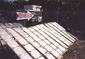 クチトンネルまでの道中、ライスぺーパーを作っている工房を見学した。右写真は、薄く平たく延ばした出来立てのライスペーパーを、天日で干しているところである。