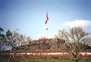 古い街だ。お世辞にもきれいな街ではない。道に砂や埃が積もっている。フォーン川に架かるフースアン橋を渡る。でかい橋だ。相変わらずバイクの交通量が多い。橋の途中から、ゆったりとしたフォーン川を眺める。やわらかな陽光が、川面をきらきらと照らしている。今から34年前、ここでベトナムとアメリカの血で血を洗う戦闘があったとは思えないほど、今は平和なたたずまいを見せている。対岸には、フエの象徴、フラッグタワーが見える(右写真)。